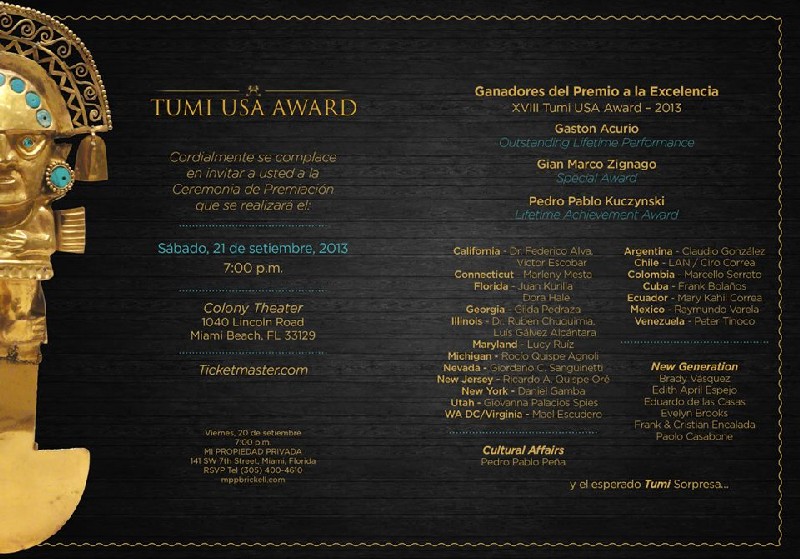 The Tumi Awards are given to the most notables Peruvians in the United States. It is considered the “Hall of Fame of the Peruvian Community” and took place on Saturday, Sept. 21 at the Colony Theatre, located at 1040 Lincoln Road, Miami Beach, Fl. 33139.
